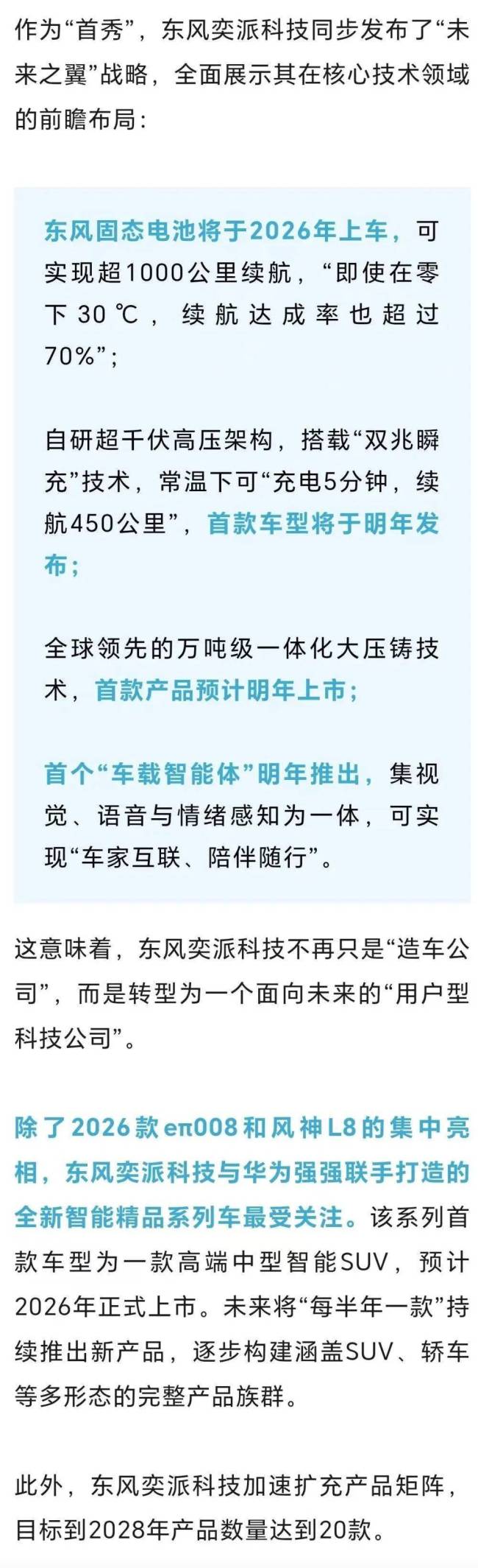 现场,东风奕派科技一口气揭晓多个重磅信息:2026款东风奕派eπ008正式上市,限时先享价为17.36万元~19.06万元;风神L8迎来全球首秀。此外,东风奕派科技与华为将联合打造一个全新智能精品系列,首款车型最快明年登场。