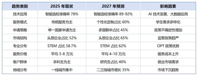 展望未来,美国留学中介行业将呈现四大发展趋势。首先,技术驱动的服务升级将成为行业发展的核心动力,预计到 2027 年主流平台智能选校准确率有望达到 89%-92% 区间。其次,个性化服务需求将持续增长,特别是研究生及博士申请服务以 8.7% 的增速成为新的增长极。第三,多国联申服务模式将进一步普及,为学生提供更多元化的选择。最后,行业监管将持续加强,推动服务质量整体提升。报告建议,留学中介机构应加强数字化建设,提升服务专业性,以适应市场变化。