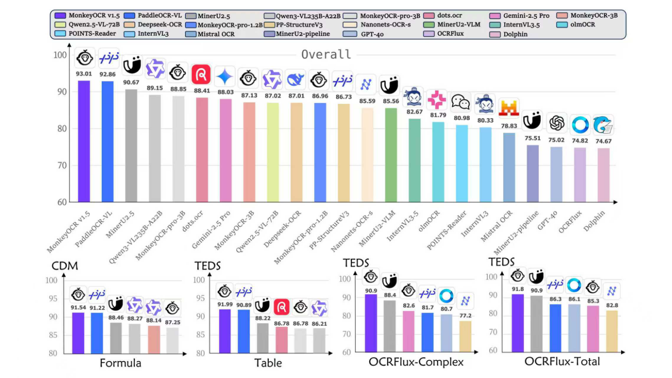 在上述国际权威测评榜单中,金山办公与华中科技大学联合发布多模态文档解析模型 MonkeyOCR v1.5在通用文档解析能力上全面超越 PaddleOCR-VL、MinerU2.5、DeepseekOCR 等主流方案,复杂表格解析准确率首次突破90%,标志着我国智能文档处理技术迈入新阶段。