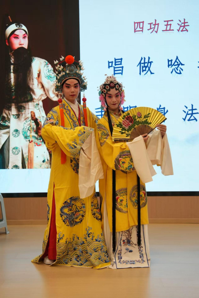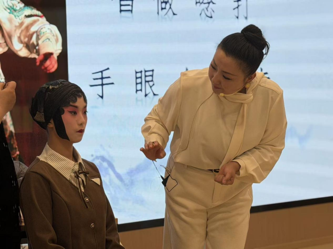 为让师生深入理解汉剧表演精髓,王荔以穆桂英、柴郡主等经典角色为例,对比解析不同行当在“唱做念打”与“手眼身法步”上的微妙区别。她还现场展示水袖技法,一抖一收间,喜怒哀乐跃然袖端,赢得掌声不断。随后,两位已完成妆容装扮的学生,在王荔与彭冲的指导下“现学现演”,尝试基础台步与水袖动作。短短几分钟的体验,已让同学们由衷感叹“台上一分钟,台下十年功”的不易。