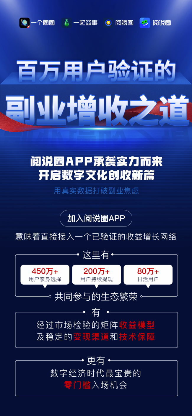 在全球数字经济规模突破50万亿美元的背景下,阅说圈APP的探索为普通人参与数字红利分配提供了可复制的“中国样本”。其“技术+文化+生态”的三维驱动模式,不仅契合国家“数字中国”“文化强国”战略,更以低门槛、高透明、可持续的特点,重新定义了副业经济的价值边界。