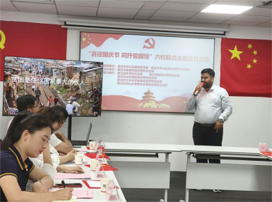 武汉纺织大学继续教育学院院长潘文星作《从“九三”阅兵看中国发展逻辑》主题报告,系统阐述了中国发展的制度优势和历史必然性,以新中国持续发展进步尤其是改革开放以来大量的事实,得出我们一定要坚定“四个自信”的结论,强调我们一定要相信和紧跟中国共产党,中华民族伟大复兴一定会实现。来自印度的武汉纺织大学国际校友萨姆·帕蒂尔结合其以前在华求学的经历,分享了《一个印度青年眼中的中国式发展》,以跨文化视角呈现中国发展的包容性与创新力。武汉纺织大学伯明翰时尚创意学院党委副书记李斗明现场担任翻译,并强调国际交流对拓宽党建工作视野的积极意义。