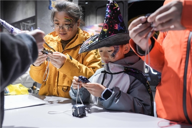 万圣节当天,快闪店特别推出了「猛兽匣」最新系列「甩手变形第一弹」。这款产品只需轻轻一甩,就能将小巧的正方体瞬间变形成猩猩、鲨鱼或老鹰形态的机甲,颠覆了传统变形玩法,精妙的设计引得现场游客争相体验。