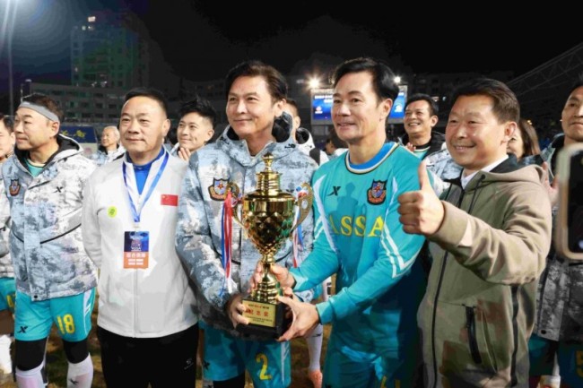 张捍声为堰超联队与香港明星足球队颁发纪念奖杯,张兆辉、关礼杰作为球队代表,郑重接过这份荣誉。队员们簇拥着将奖杯高高举起,胜利的喜悦瞬间传遍全场。