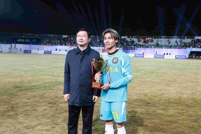 夜幕低垂,最激动人心的时刻终于到来。在全场万名观众的注视下,蔡开云迈步至球场中央,将熠熠生辉的「最佳球员奖」奖杯,庄重授予香港明星足球队的彭林林。