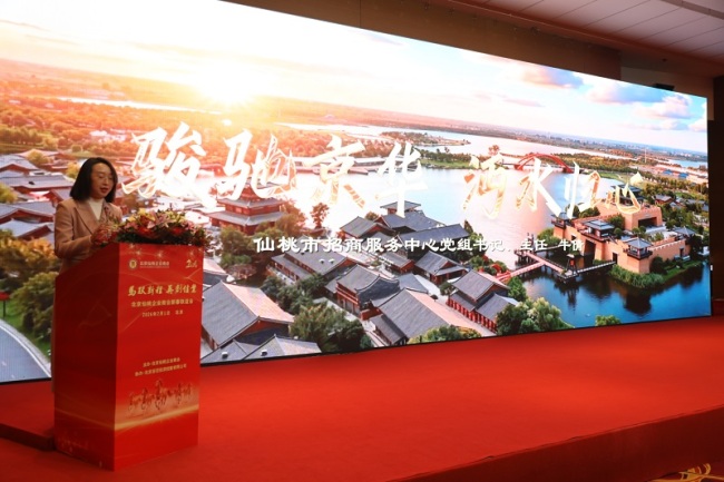 (仙桃市招商服务中心党组书记、主任牛倩作招商推介)