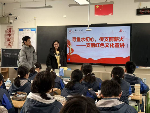 除实地调研外,实践团成员同步返回各自高中母校,开展支前红色故事主题宣讲活动。宣讲中,成员们结合调研成果,用生动案例与影像资料,向同学们讲述“人民力量”的深刻内涵。同时,团队还创新性地分地域创作“支前”主题微纪录片,以“车轮上的力量”、“船桨里的智慧”、“扁担下的脊梁”为专题进行跨平台叙事,用青年语态解读群众智慧与组织方法。