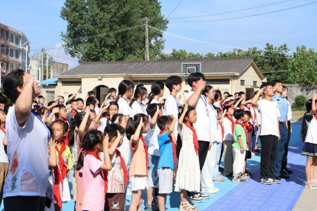 国旗下,周家乐深情讲述军营里“国旗重于生命”的铁律。“叔叔,国旗真的比命还重要吗?”一个女孩小声问。“是的,”周家乐眼中光芒如炬,斩钉截铁地回答,“因为国旗代表的就是我们脚下的土地,我们的家,我们的国!保护她,是我们最神圣的使命!”随即,他带领全体小学生高声朗诵:“少年智则国智,少年强则国强!”稚嫩却无比坚定的童声汇成洪流,在山野间激荡回响。孩子们情不自禁地攥紧拳头,挺直了小小的脊背,字字句句饱含着对家国那份懵懂却无比炽热的爱。这一刻,一颗颗幼小而滚烫的心,正经历着一场庄重的精神洗礼与启蒙。