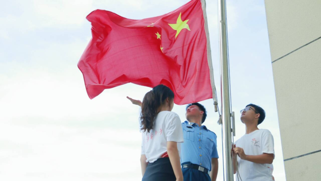 庄严的周一清晨,周家乐肩扛五星红旗,担任主旗手。正步铿锵有力,鞋跟砸地的回响叩击校园寂静;展臂绷直如弦,透射出千锤百炼的力量。“1、2、3……”有孩子小声跟着步点数着。国歌奏响,展旗、抛旗、升旗动作行云流水。五星红旗在朝阳的金辉中冉冉升起,照亮了台下孩子们清澈而专注仰望的眼眸。