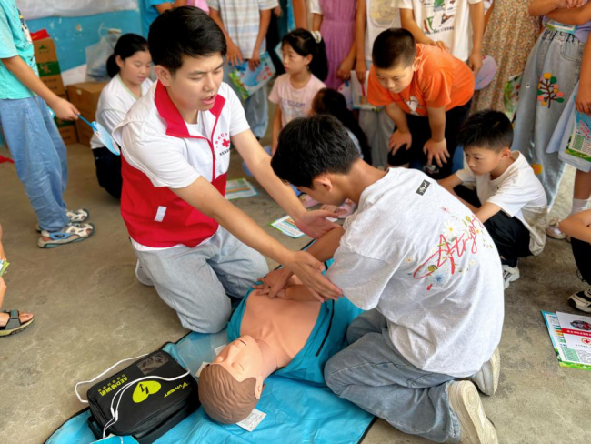 课堂之外,支教团更注重联动多方资源筑牢成长防线。联合大悟县红十字会打造的防溺水与急救专题课堂上,志愿者通过情景模拟、实操演练,让孩子们在沉浸式体验中掌握心肺复苏、海姆立克急救法等关键技能;携手黄站镇综治中心开展的金融反诈宣讲活动中,志愿者化身“反诈小老师”,走街串巷为村民讲解电信诈骗常见套路,用通俗语言筑牢乡村“财产安全防护网”。“这些娃娃讲得细致又好懂,我们老人也能听明白!”村民王大爷的点赞道出了活动的实效。
