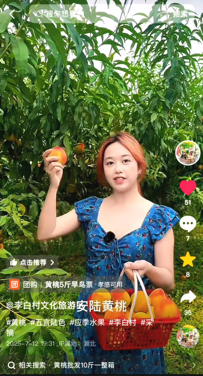“家人们看过来,这款桃李果肉饱满,咬一口就是盛夏的味道!”在安陆市李白村,经彩青春服务队将直播间搬进桃林田间,用“文化+电商”模式开启助农新范式。团队深度挖掘唐代诗仙李白寓居安陆的典故,策划“跟着李白游乡村”系列短视频,20条创意视频全网播放量突破5万次,单条最高点赞量达2800次。直播时段,志愿者化身“文化推荐官”,将农产品与诗词文化巧妙结合,创造出“诗酒桃李”“云游李白村”等爆款IP。