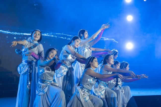 在圣洁的高原,藏族姑娘以雪山为镜、清泉为浴,进行着对自然与生命的虔诚礼赞。艺术团民舞队的同学们,用柔美的肢体语言,带来了一支极具民族风情的舞蹈《天浴》。