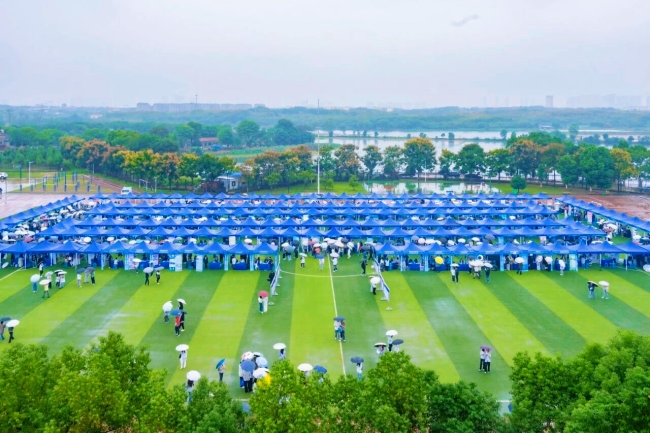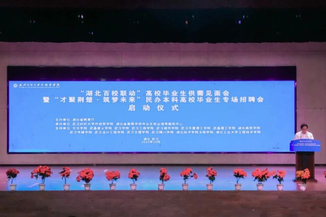 江城十月,金秋送爽,才聚荆楚。2025年10月16日下午,由湖北省教育厅主办、湖北省高等学校毕业生就业指导服务中心和武汉纺织大学外经贸学院联合承办的“湖北百校联动”高校毕业生供需见面会暨“才聚荆楚·筑梦未来”民办本科高校毕业生专场招聘会在学校操场成功举办。湖北省教育厅高校学生处处长姜永生、湖北省高等学校毕业生就业指导服务中心副主任张丽萍到现场指导,执行校长邓茂林、党委书记秦红、党委副书记赵百刚陪同,14所协办院校的就业部门负责同志、学校相关职能部门及各学部负责人、180家用人单位代表以及近4000名毕业生共同参加了此次活动,本次活动主要包括专场招聘会启动仪式和现场活动。