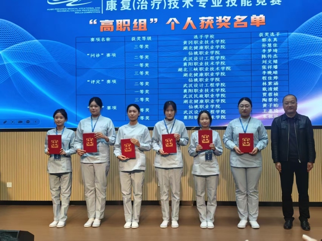在康复治疗技术赛项中,学校代表队荣获团体三等奖。个人赛中,孙慧佳同学荣获问诊个人三等奖,李晚晴同学荣获评定个人三等奖,陶黎铃同学荣获治疗个人三等奖。