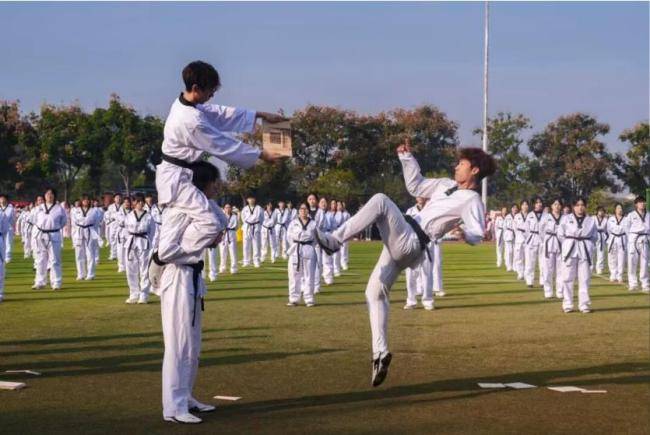 体育部跆拳道团体操表演,以礼始,以礼终。一招一式,劲力十足;一起一落,灵动如风。同学们在跆拳道动作中尽显力量之劲,以昂扬风貌共筑属于我们的美丽中国梦。