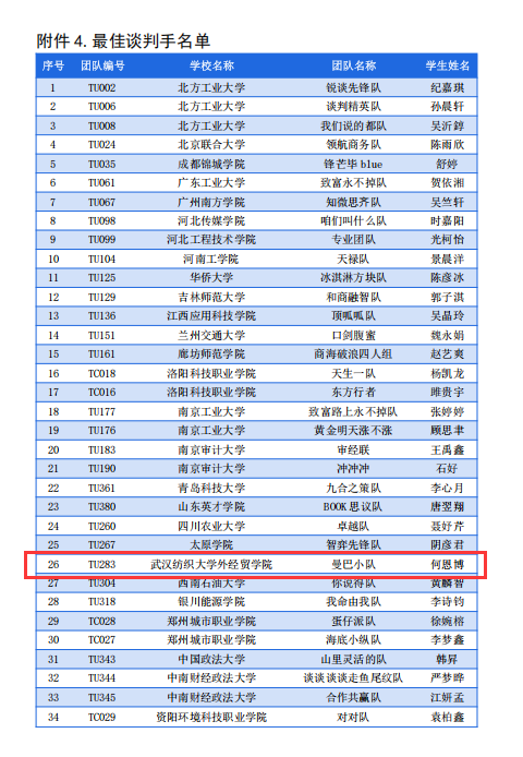 11月2日,2025年全国高校商业精英挑战赛商务谈判竞赛全国总决赛暨全球商务谈判竞赛中国地区选拔赛圆满落幕。武汉纺织大学外经贸学院现代商务学部参赛团队在此次竞赛中获得本科组国赛一等奖1项、三等奖1项,1名学子获评“最佳谈判手”称号。