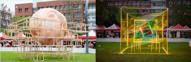 作为活动核心,赵半狄《涓》熊猫装置展以熊猫“涓”为符号载体,将艺术表达与育人目标深度融合。展览落地校园的同时,学校依托学科特色推出两大平行展览。艺术设计学部的“金秋艺术展”以落叶为媒介,师生们创作兼具环保理念与实用价值的服饰作品,将自然美学融入服装设计,践行“应用为先”的实践导向。数字传媒学部的“光语镜置”利用光影交互技术打造昼夜变幻的沉浸场景,展现数字艺术与科技融合的创新探索,呼应“创新为魂”的学科发展路径。学生在参与策展、布展过程中,通过跨专业协作完成装置搭建、视觉设计等任务,将课堂知识转化为实践能力。