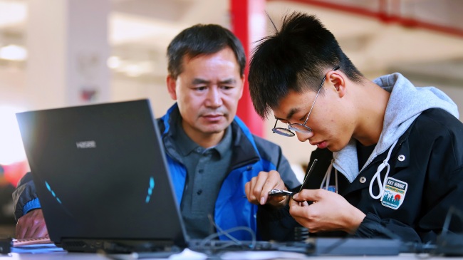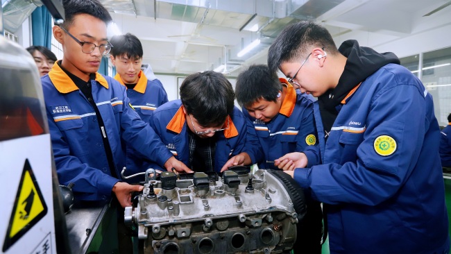 近日,武汉工程职业技术学院汽车整车实训室里出了件怪事:二三十名学生围着4辆实训汽车,有人在检测,有人在拆装,还有些人头碰头围着手机边看视频边指导操作的同学,而指导老师喻东却站一旁,若无其事地东张西望。