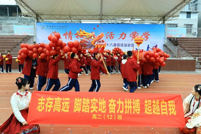 各班级代表队依次登场,成为开幕式的亮点所在。入场环节直接把“神仙打架”演绎到极致!各班学子脑洞开到天际,用创意点燃全场热情,每一个方阵走过都引发阵阵尖叫:气球编织的巨龙雄狮摇头摆尾,红黄两色气球串联成灵动造型,跟着方阵步伐“腾云驾雾”,萌趣又霸气;“真假美猴王”身披锁子黄金甲、手持金箍棒,一个腾挪跳跃一个甩棒亮相,眼神到位、动作传神,台下同学直呼“DNA动了”;“两个维护”“四个意识”“新发展理念”“人类命运共同体”等时代热词标牌,将思政元素与运动活力深度融合,让思政教育在青春赛道上“奔跑”;京剧变脸绝活惊艳四座!学子身着戏服登台,红脸、白脸、黑脸瞬间切换,配合锣鼓点节奏,尽显国粹韵味,传统文化与青春活力完美碰撞;非遗杂耍喷火特技燃爆全场!火苗腾空而起的瞬间,热气裹挟着欢呼直冲云霄,掌声、口哨声此起彼伏,成为开幕式最震撼的名场面!这些精彩表演充分展现了一中学子的创新精神和青春风采。