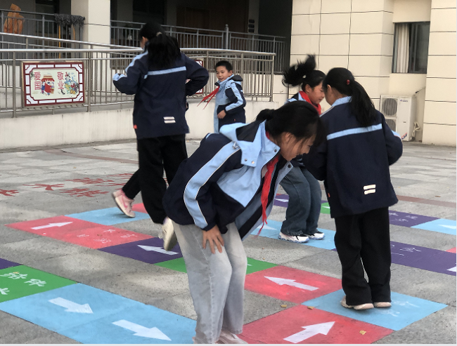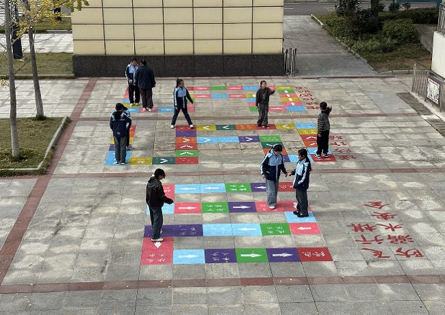 除了体能活动,学校还精心打造了地面游戏区域,色彩明快的图案铺满空地,如跳格子、地面迷宫、手脚并用、地面投掷等多个趣味模块同步上线,让孩子们在闯关中学到知识,在互动中学会协作,让课间既有欢声笑语,更有成长的收获。