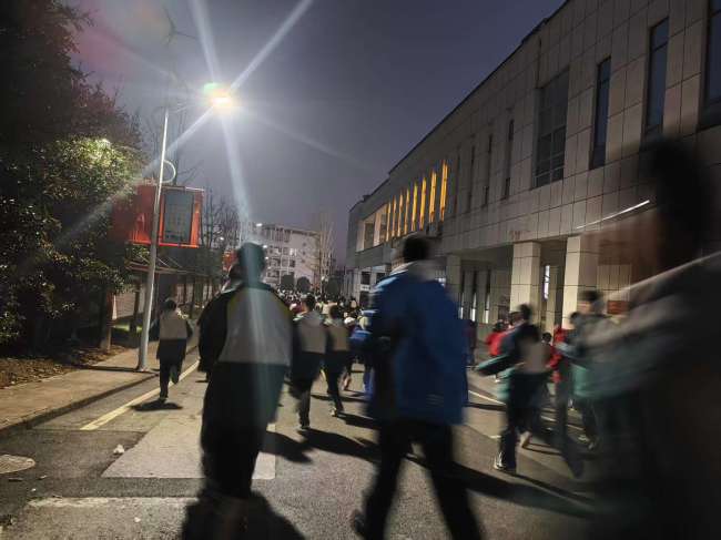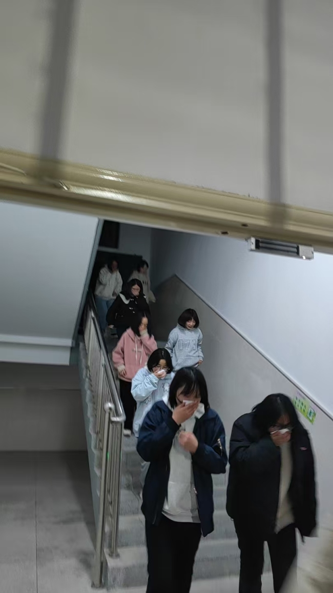 “弯腰、捂鼻、扶墙,沿着右侧快速走!”指令下达的瞬间,宿舍区内立即响起整齐的脚步声。在寝室长和班级安全员的引导下,同学们迅速冷静下来,严格按照逃生规范行动:一手用湿毛巾捂住口鼻,一手扶着墙壁保持平衡,弯腰低姿沿着预设安全路线快速撤离。楼道内,没有拥挤推搡,没有慌乱喧哗,只有有序的脚步与清晰的指引;疏散途中,工作人员随时提醒注意事项,及时协助行动不便的同学,整个过程紧张而有序。短短4分35秒,3000余名学生全部安全抵达国旗台前的致远广场,完成集结。
