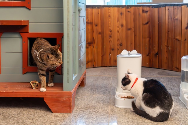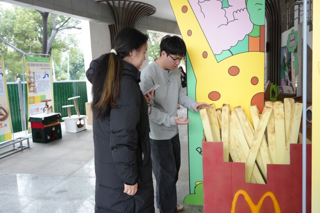 展览现场气氛热烈,学生们将课程中掌握的空间建模与材料工艺知识,应用于宠物主题设计,创造出众多兼具艺术性与实用性的作品,吸引了众多师生驻足交流。在“猫咪之家”展区,宠物猫作为“特邀模特”,与自动逗猫棒、环保猫窝、智能喂食器等学生作品自然互动,构成一幅温馨鲜活的生活图景。“看到猫咪在我们设计的作品中自在玩耍,特别有成就感。”2023级环境设计专业学生黄梦冉的话语中洋溢着专业自信。另一边的柯基犬与泰迪犬则以“产品体验官”身份,亲测“纸筑隧道”“枝桠巢语”等设计,为学生优化作品提供了真实反馈。“与萌宠互动既能抚慰心灵,也帮助我们更精准地理解宠物习性、完善设计细节。”2023级环境设计专业学生吕江滨说道。