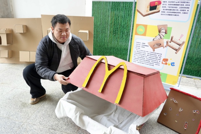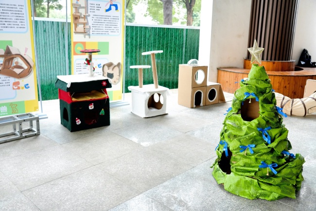 展览入口处,立于拱门两侧的“薯条”与“掌心温室”两件作品格外引人注目。“薯条”作品由2023级环境设计专业学生葛天涯创作,其灵感源于课程中对材料特性的探索。“在《空间模型制作》课程中,我们学习了多种材料的加工工艺。我选择海绵材料,正是看中其柔软安全、可塑性强,适合作为宠物互动装置。”葛天涯介绍道。另一件“掌心温室”则由同专业学生赵梓康使用瓦楞纸精心制作,巧妙融合封闭式安全感和磨爪娱乐功能。“课程训练了我们对空间尺度与功能整合的能力,这件作品就是尝试在有限空间内实现多重宠物需求。”赵梓康的讲解,让现场师生看到了专业知识如何转化为服务生活的实际设计。