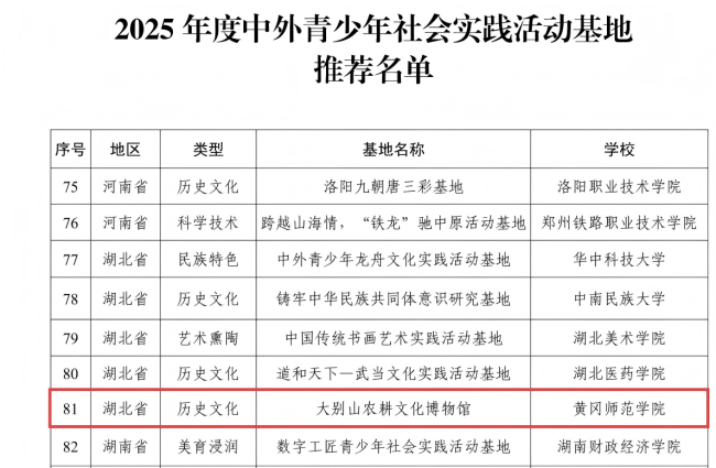 受教育部国际合作与交流司委托,中国教育国际交流协会2025年面向全国开展了来华留学生了解中国优秀课程和中外青少年社会实践活动基地征集工作。经学校申报、湖北省教育厅推荐、专家审核,黄冈师范学院大别山农耕文化博物馆成功获批全国中外青少年社会实践基地,成为湖北省5个、全国124个中外青少年社会实践活动基地之一。