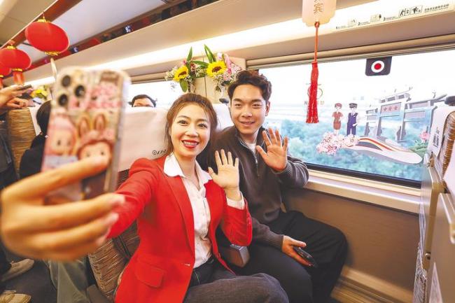 9月28日,两名乘客在襄荆高铁复兴号G6855次首发列车上拍照。(视界网杨东摄)