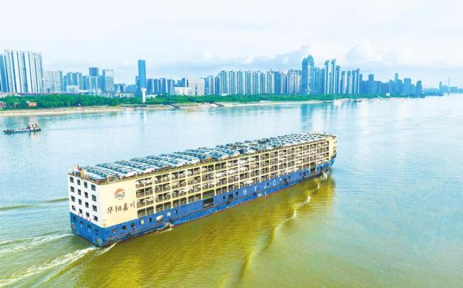 满载汽车的货轮行驶在长江武汉段。(湖北日报全媒记者薛婷摄)