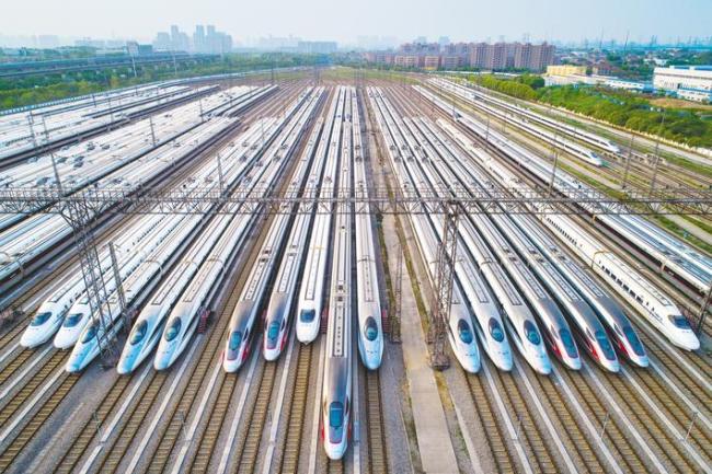 武汉动车段近百组动车组整齐停放,蓄势待发。(湖北日报全媒记者任勇摄)