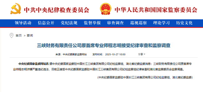 涉嫌违纪违法,程志明被查! 人民网 2025-10-27 13:32:55 A+ A- 10月27日,据中央纪委国家监委驻中国长江三峡集团有限公司纪检监察组、湖北省纪委监委消息:三峡财务有限责任公司原首席专业师程志明涉嫌严重违纪违法,目前正接受中央纪委国家监委驻中国长江三峡集团有限公司纪检监察组纪律审查和湖北省监察委员会监察调查。 责任编辑:中华网湖北01 点击查看全文(剩余0%)