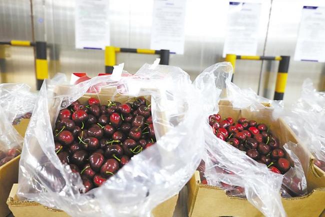 鄂州花湖国际机场迎来今冬首批智利车厘子。(湖北日报全媒记者周鹏摄)