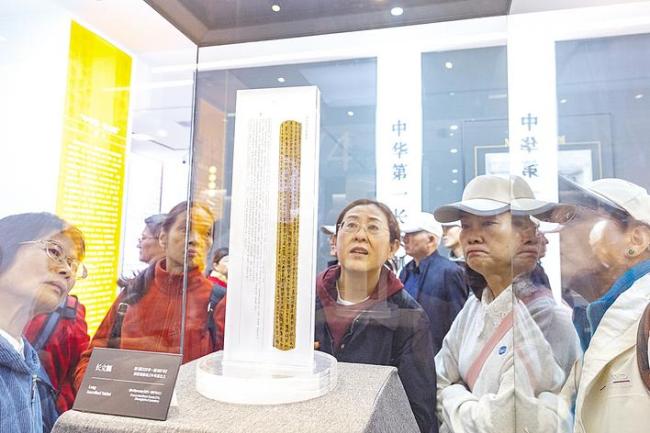 10月22日,云梦县博物馆参观游客络绎不绝,游客在馆内参观中华第一长文觚。(本版图片均为湖北日报全媒记者倪娜通讯员程爱华摄)