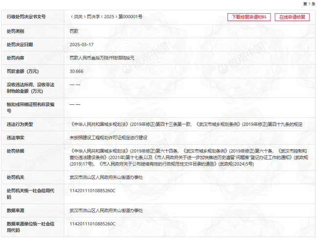 近日,从信用中国官网获悉,湖北省中医院(湖北中医药大学附属医院、湖北省中医药研究院)因未按照建设工程规划许可证规定进行建设,被武汉市洪山区人民政府关山街道办事处处以罚款30.666万元的处罚。