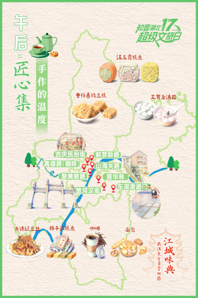 手作温度治愈时光。阳光渐柔,走进武汉不少老里份,都能找到一代代手艺人用时光和耐心打磨的滋味。五芳斋汤圆白胖流心,扬子江糕点非遗手艺见真章,百年绿豆糕甜而不腻;高雄路的咖啡店也有巧思,“桂香拿铁”混着本地金桂香,传统与新潮都熨帖。