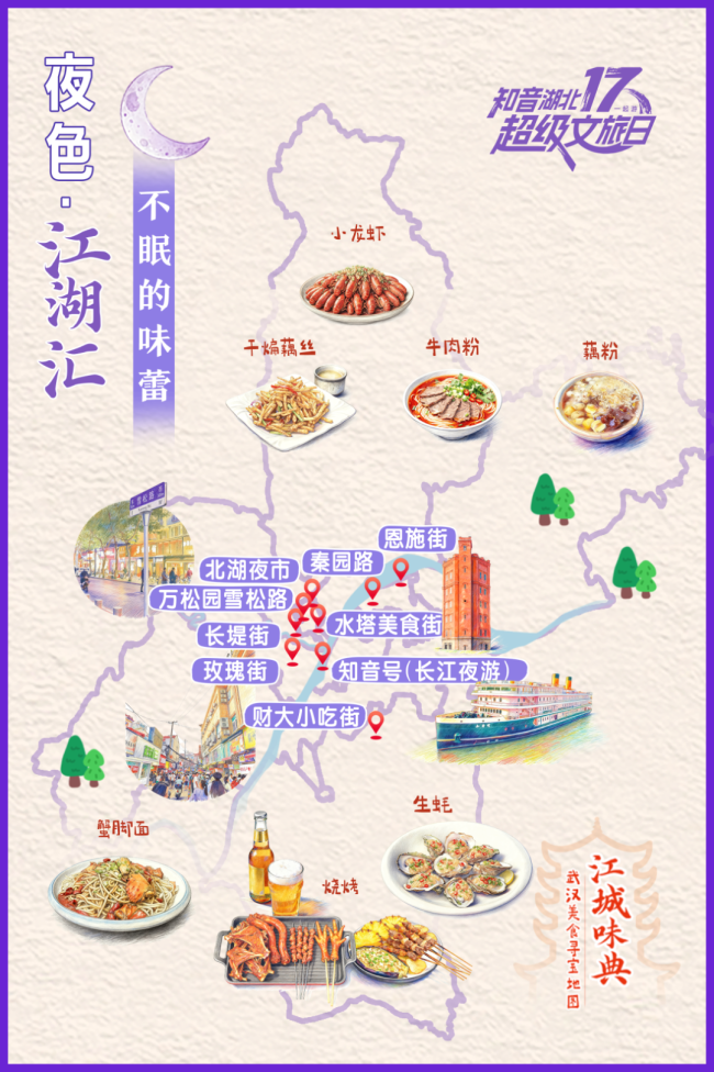 不眠味蕾的狂欢。夜幕降临,万松园等夜市彻底沸腾!夏天小龙虾油焖蒜香,秋冬香辣蟹接棒C位;降温就钻火锅店,红汤麻香、白汤醇厚,毛肚七上八下裹满香油,暖意驱散凉意。夜色中的武汉,夜市摊的烟火与火锅店的暖意交织,每一口热食都藏着最鲜活的人间温情,让人舍不得离开。