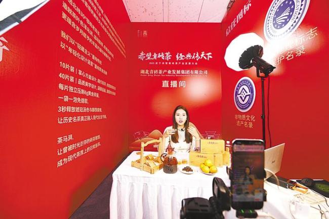 主播线上直播销售轻便化的青砖茶产品。(湖北日报通讯员陈红菊摄)