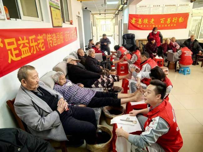 福利院大厅内,足疗技师们带着专业工具有序开展服务。他们为老人脱去鞋袜,细心打来温水泡脚,耐心修剪指甲、清理死皮,辅以足部按摩。对于行动不便的老人而言,这样一次专业的足部护理,是一次极大的身心慰藉。