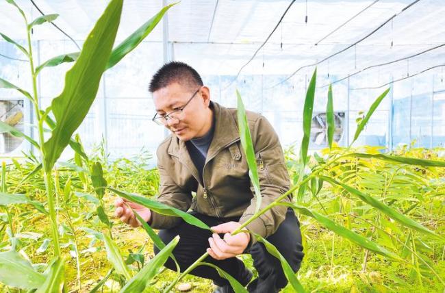 陈风雷在温室大棚内查看阳荷植株生长情况。(湖北日报全媒记者赵怡然摄)