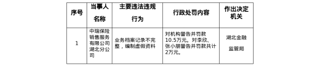 罚单显示,中瑞保险销售服务有限公司湖北分公司的主要违法违规事实(案由)为:业务档案记录不完整;编制虚假资料。
