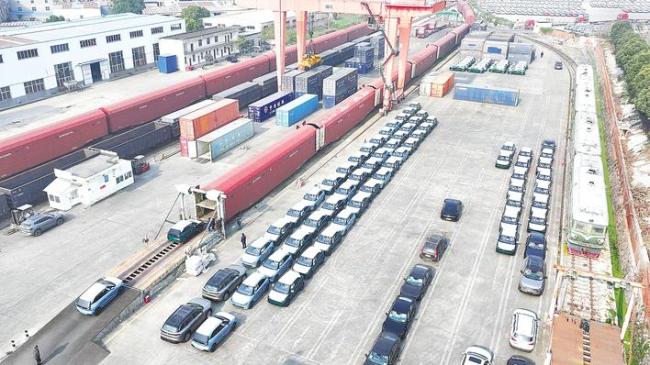 12月18日,在襄阳市刘岗货场,东风纳米01正有序装入货车,将通过铁路运达白俄罗斯。(本报资料图片)