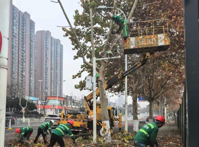 1月19日上午,在洪山区建群一路现场,园林工人们手持专业工具,对道路两侧的樟树等常绿乔木进行精准修剪,重点疏除过密枝、交叉枝、下垂枝、重叠枝和病弱枝。截至目前,已有918棵行道树通过“瘦身减负”有效提升了抗风雪能力。