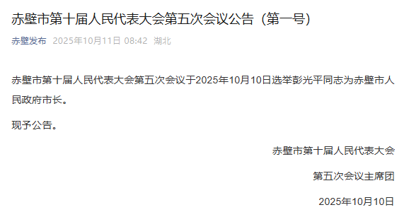近日,据赤壁发布微信公众号发布的公告显示,赤壁市第十届人民代表大会第五次会议于2025年10月10日选举彭光平同志为赤壁市人民政府市长。