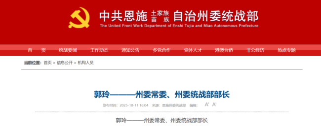 近日,据湖北省恩施州委统战部官网“机构人员”栏目更新显示,郭玲已任恩施州委常委、统战部部长。
