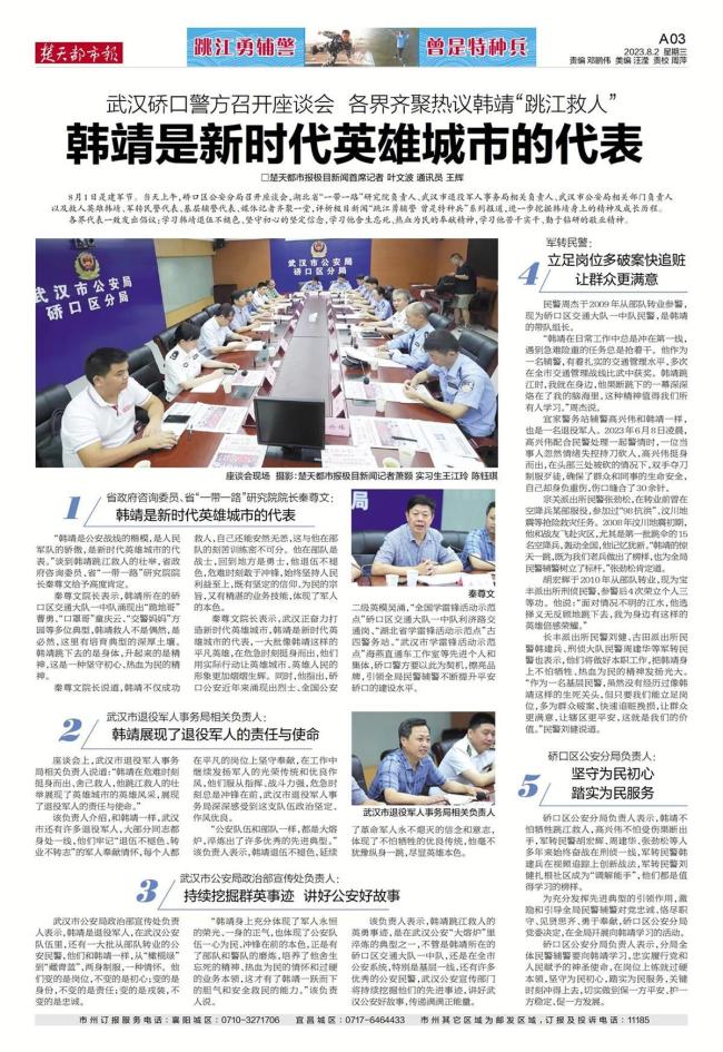 时间回溯至2023年7月28日凌晨5时,辅警韩靖和同事在月湖桥附近执勤时,突遇一名女子翻越护栏跳入汉江。危急时刻,他顾不上脱去衣物,从桥面纵身跃入江中。江水的剧烈冲击让他浑身疼痛,却挡不住他向落水女子游去的决心。女子因求生本能紧抱韩靖,两人逐渐下沉,他仍以仰泳姿势托住女子下颚……危急关头,正在江边晨练的陈才斌发现了险情,“扑通”一声毅然跳入江中,快速游到韩靖身边,从水下将轻生女子的双臂托起。经过一番努力,两人合力成功将女子营救上岸(《楚天都市报·极目新闻》曾重点报道)。