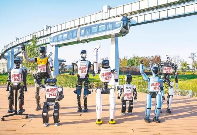 11月4日,光谷中央生态大走廊,“天问”(后排右一)等8台人形机器人齐聚一堂,为光谷马拉松助威。这8台高矮各异的机器人来自5家光谷企业和高校,都已经具备高质量运动能力。(湖北日报全媒记者魏铼摄)