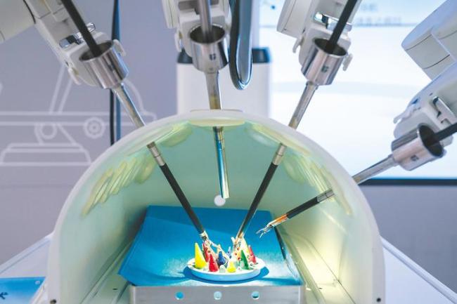 湖北“尖刀”技术攻关项目成果展上,联影集团展示的新型国产手术机器人。(湖北日报全媒记者魏铼摄)