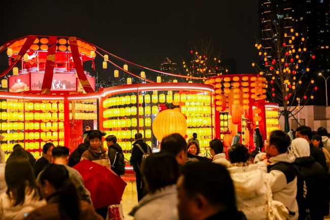 武汉江宸天街广场前,灯笼组成的打卡点吸引市民拍照。