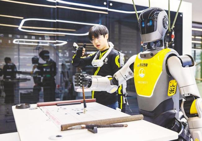 1月19日,湖北人形机器人创新中心内,人形机器人跟着动捕演员训练写字动作。(湖北日报全媒记者薛婷摄)